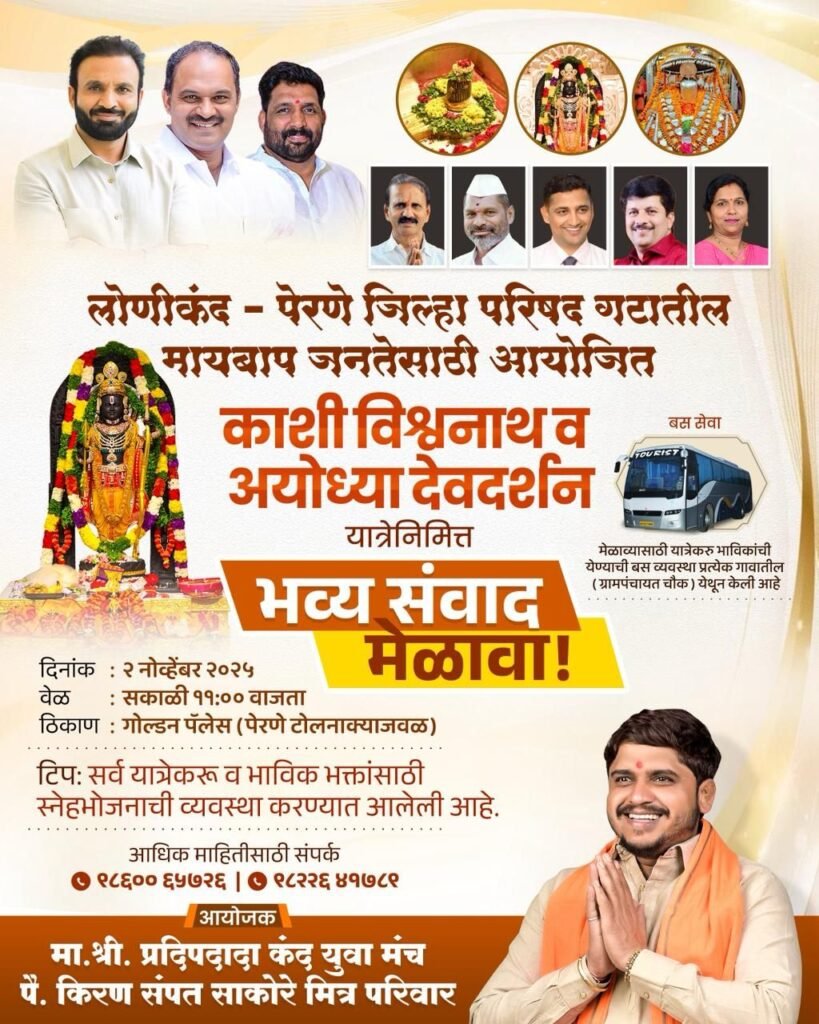 लोणीकंद (ता. हवेली) : १ नोव्हेंबर २०२५ ,भक्तीचा उत्सव, समर्पणाचा संकल्प! करत काशी-अयोध्या यात्रेनिमित्त हवेली तालुक्यातील पेरणे-लोणीकंद जिल्हा परिषद गटातील मायबाप जनतेला अध्यात्मिक समाधान मिळावे आणि समाजात श्रद्धा, संस्कार व समाज एकतेचा तसेच भक्ती व समर्पणाचा संदेश जावा, या उदात्त हेतूने ‘प्रदिपदादा कंद युवा मंच’ आणि ‘पै. किरण साकोरे मित्र परिवार’ यांच्या वतीने मोफत काशी विश्वनाथ-अयोध्या देवदर्शन यात्रेचे भव्य आणि गौरवास्पद आयोजन करण्यात आले आहे.