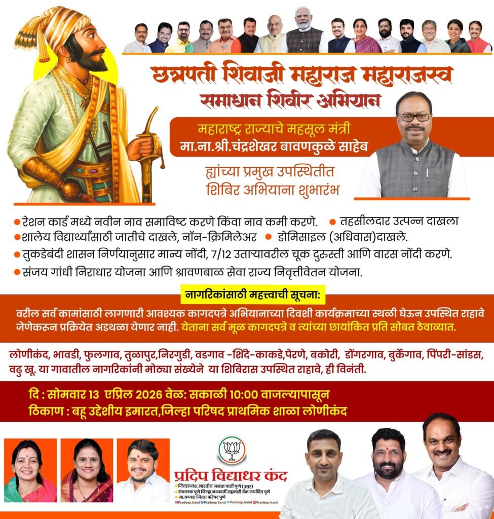 लोणीकंद (ता. हवेली) सामान्य नागरिकांच्या दैनंदिन महसुली अडचणी आणि प्रलंबित शासकीय कामे मार्गी लावण्यासाठी पेरणे-लोणीकंद जिल्हा परिषद गटात ‘छत्रपती शिवाजी महाराज महाराजस्व समाधान शिबीर अभियान’ राबवण्यात येत आहे. या भव्य शिबिराचा शुभारंभ सोमवार, १३ एप्रिल रोजी सकाळी १० वाजता राज्याचे महसूलमंत्री चंद्रशेखर बावणकुळे यांच्या हस्ते होणार आहे. प्रशासकीय यंत्रणा थेट जनतेच्या दारी नेणाऱ्या या उपक्रमामुळे लोणीकंद परिसरातील हजारो नागरिकांना मोठा दिलासा मिळणार आहे.